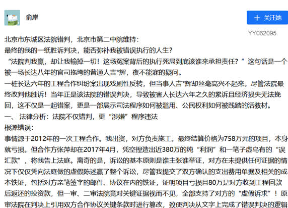 我希望用我的经历,叩问司法系统的问责机制:当法院自己犯错时,究竟有没有勇气和能力,给受害者一个真正公平的交代?我呼吁相关部门介入,监督此案的后续执行与问责,行为不能让正义止步于判决书,纠错,绝不能止于一纸胜诉判决,必须延伸到对错误所造成损害的彻底弥补!