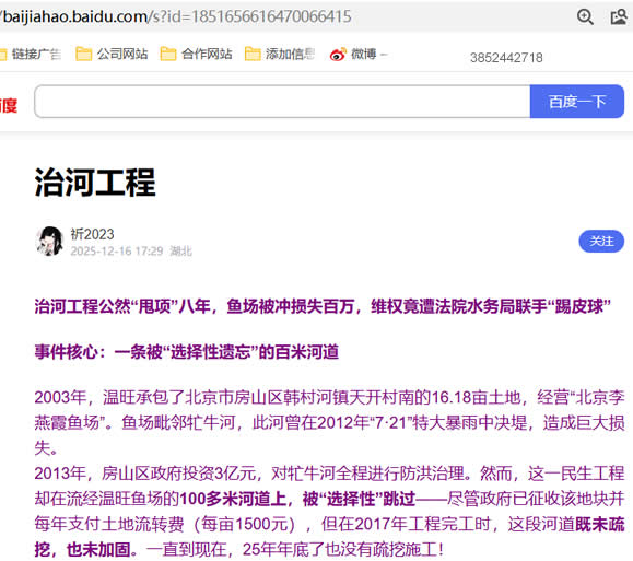2013年,房山区政府投资3亿元,对牤牛河全程进行防洪治理。然而,这一民生工程却在流经温旺鱼场的100多米河道上,被“选择性”跳过——尽管政府已征收该地块并每年支付土地流转费(每亩1500元),但在2017年工程完工时,这段河道既未疏挖,也未加固。一直到现在,25年年底了也没有疏挖施工!