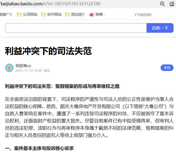 在全面依法治国的背景下,司法程序的严谨性与司法人员的公正性是维护当事人合法权益的核心保障。然而,韶关大粤房地产开发有限公司(以下简称“大粤公司”)与自然人曹某鸣在案件中,遭遇了一系列违背司法程序的对待,不仅被剥夺了基本诉讼权利,还面临财产权益的重大损失。尽管目前案件已有中院受理再审,但审判人员的违法犯罪、渎职行为与再审程序本身属于截然不同的法律范畴,冤假错案的纠正与相关人员责任的追究人等待上级部门强力介入。